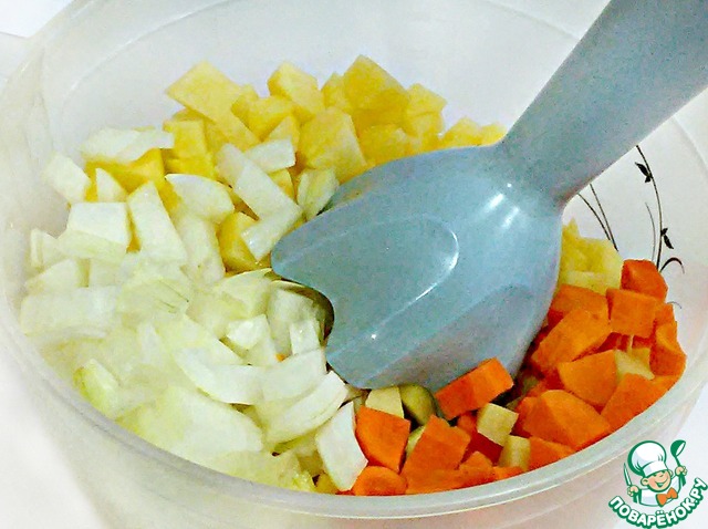 Оладьи. Картофель, морковь и лук порезать мелко. Измельчить блендером в пюре.