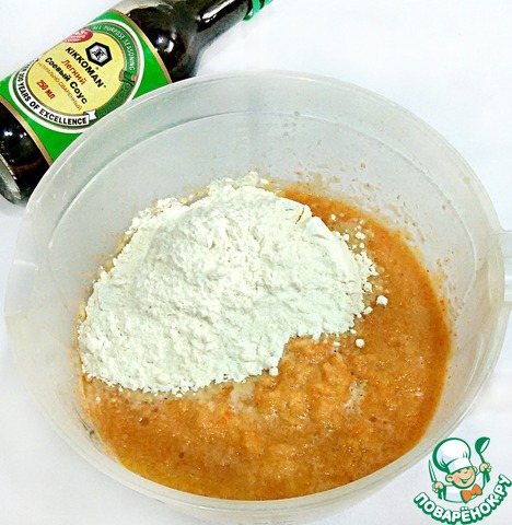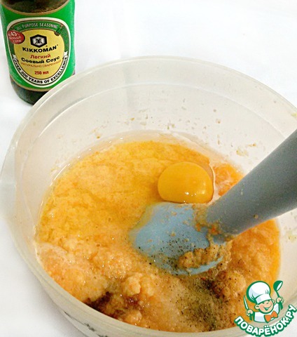Добавить яйцо, специи по вкусу и соевый соус ТМ Kikkoman, благодаря которому вкус становится насыщеннее.
