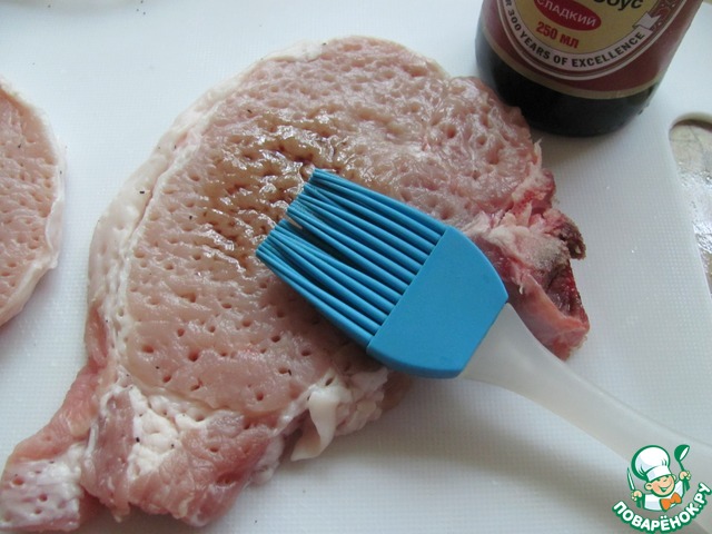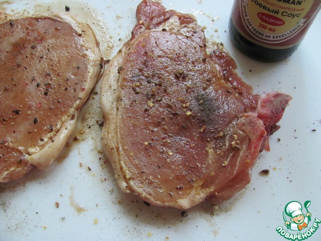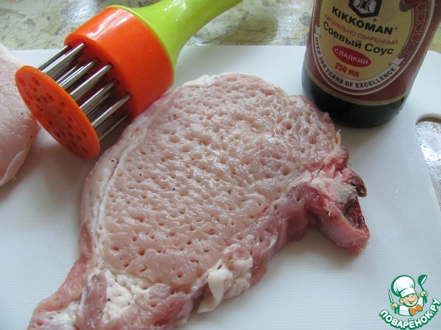 Корейку разрезать на два куска. Помыть. Просушить бумажным полотенцем. Пройтись по ней тендерайзером или слегка отбить.
