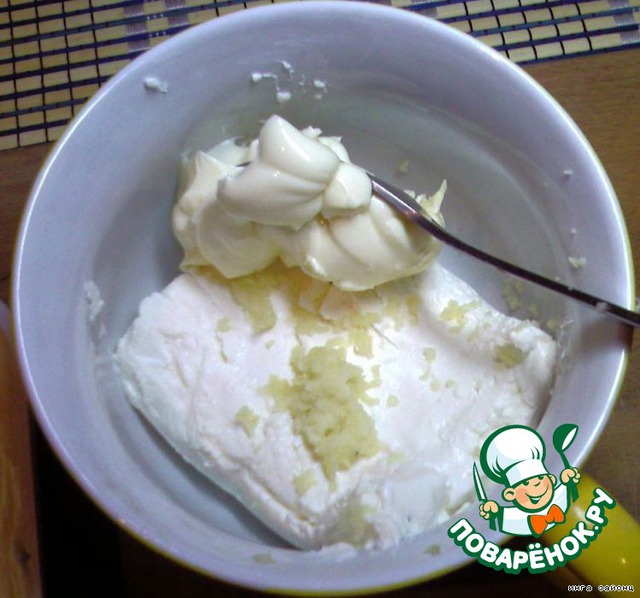 Пока валованы запекаются, приготовить начинку. Творог (или рикотту) размять вилкой, добавить чеснок. Плавленный сыр можно не добавлять (вместо него вполне подойдет 2 ст.л. майонеза или густой сметаны, т. к. сыр не чувствовался)