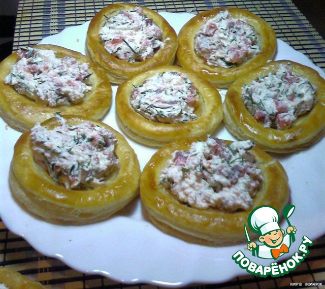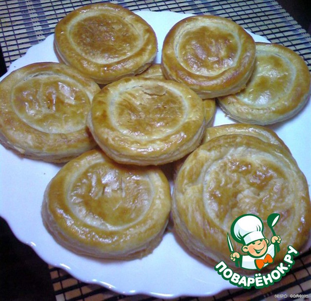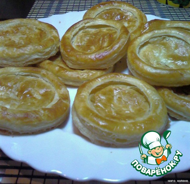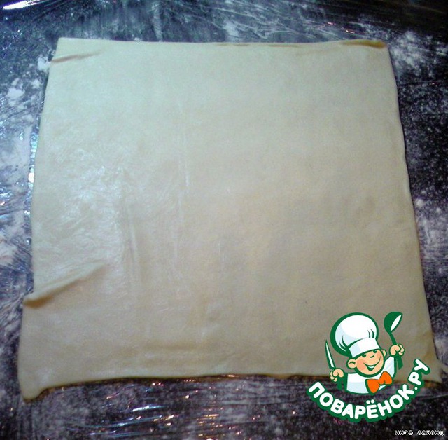 Оттаять тесто в прохладном месте. Раскатать не тонко (у меня были коржи для "Наполеона" раскатанные очень тонко - и получились не очень высокие валованы). Поэтому раскатайте тесто в 2 раза толще, чем для "Наполеона".
