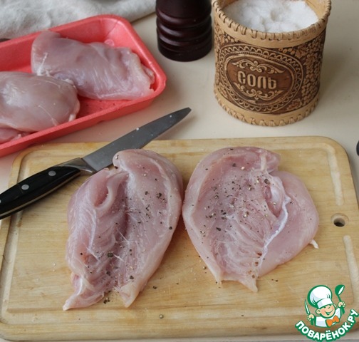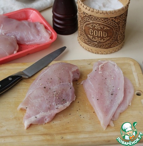 Филе куриной грудки вымыть, обсушить, приправить солью и свежемолотым черным перцем.