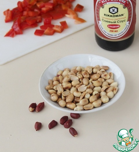 Начнем с куриной грудки по-китайски, для этого красный сладкий перец очистить от семян и нарезать небольшими кубиками.