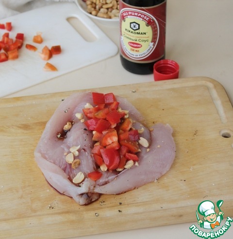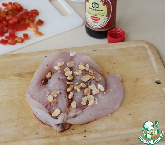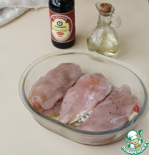 Взять куриную грудку, раскрыть, полить соевым соусом Kikkoman