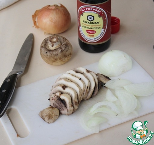 Для этого нарезать полукольцами половину луковицы и тонкими ломтиками шампиньон.