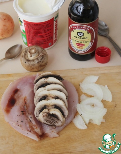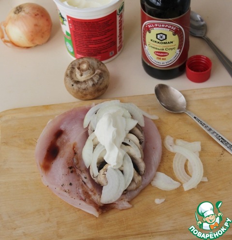 Куриное филе полить соевым соусом Kikkoman, на половину филе выложить рядком грибы, сверху нарезанный лук.