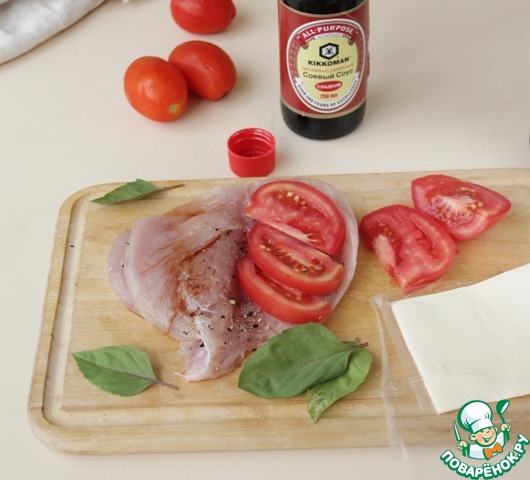 Следующую приготовим по-итальянски. Идем тем же путем, куриное филе полить соевым соусом Kikkoman, выложить нарезанный ломтиками помидор, на помидор разложить листочки базилика.