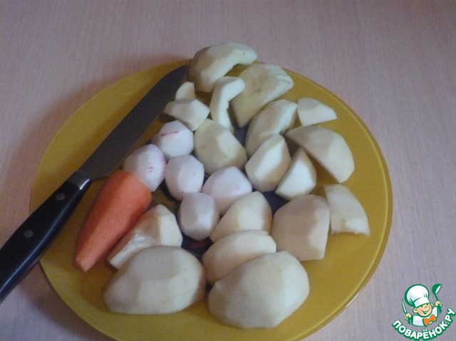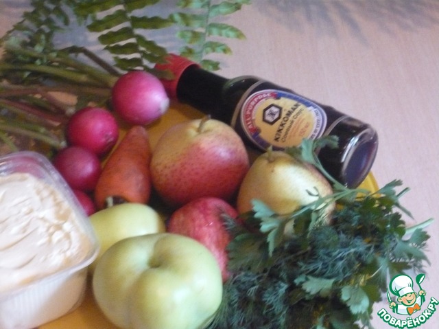 Кубиком режем яблоки и грушу и натираем на терке редис и морковь. Смешиваем ингредиенты, добавляем соевый соус и сметану.
