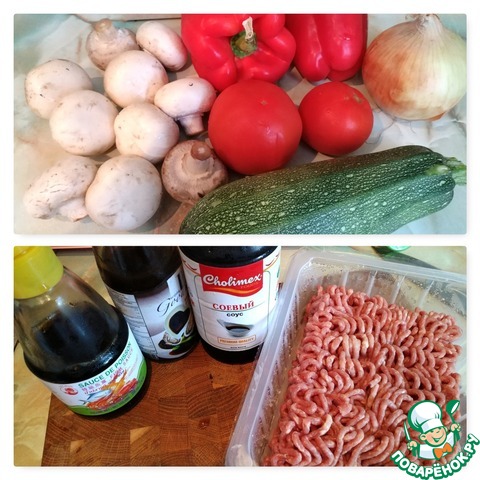 Вот что нам понадобится. Вместо фарша можно использовать куриное филе, порезанное соломкой, я еще делала с тунцом тоже очень вкусно.