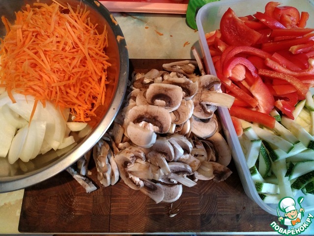 Лук режем полукольцами, морковь трем на крупной терке, лучше для моркови по корейски, или режем тонкой соломкой. Грибы слайсами, остальные овощи брусочками, сильно не мельчить. Ребро брусочка примерно 5мм.