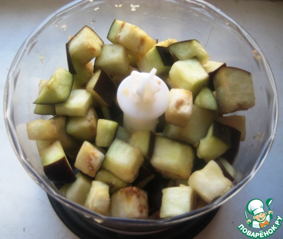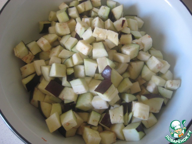 Баклажаны вымыть, нарезать кубиками, добавить щедрую щепотку соли, залить водой и оставить на 20-30 минут. Затем воду слить, баклажаны промыть холодной водой.