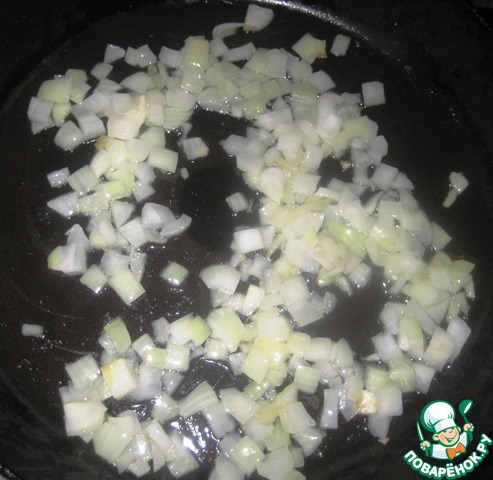 Мелко нарезать лук, обжарить на сковороде до золотистого цвета.
