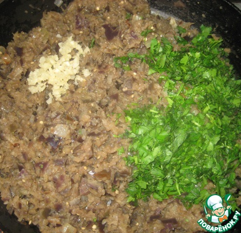Добавить измельченный чеснок, петрушку и кинзу. Перемешать. приправить солью и перцем.