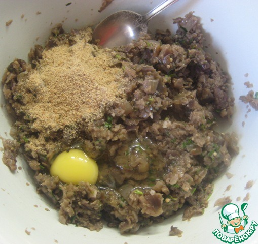 В остывший фарш добавить яйцо и панировочные сухари, тщательно перемешать.