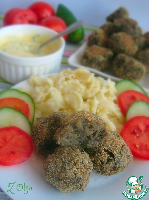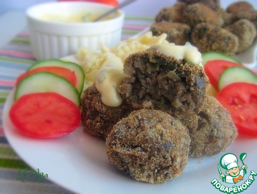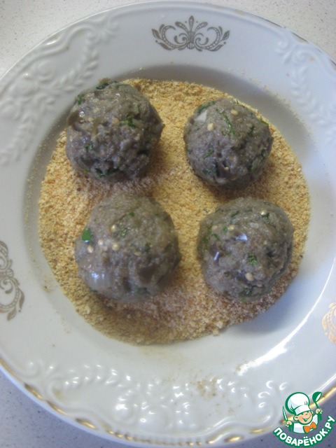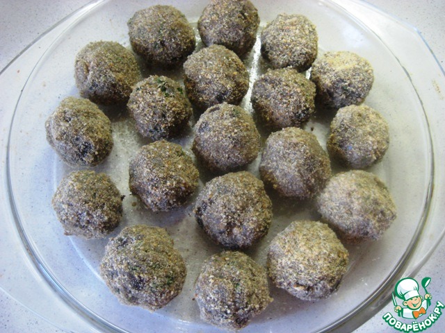 Сформировать небольшие фрикадельки ( у меня получилось 19 шт.), запанировать их в сухарях.
