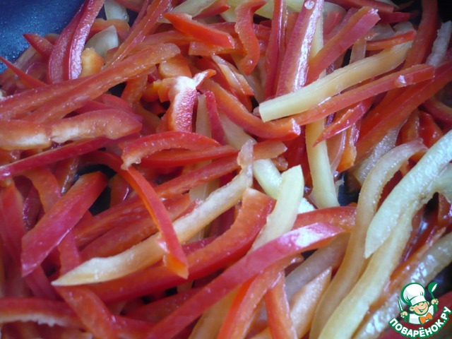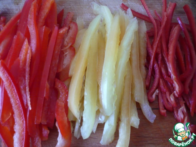 Болгарский перец (у меня разноцветный) и перец чили нарезать соломкой.