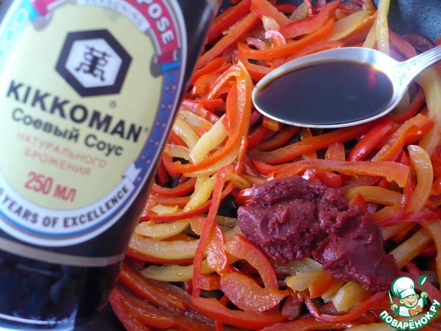 Добавить к обжаренным овощам соевый соус ТМ "Kikkoman", томатную пасту и сахар.