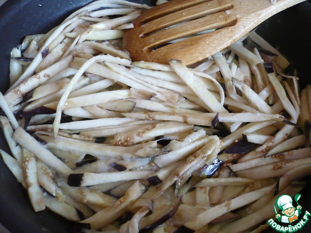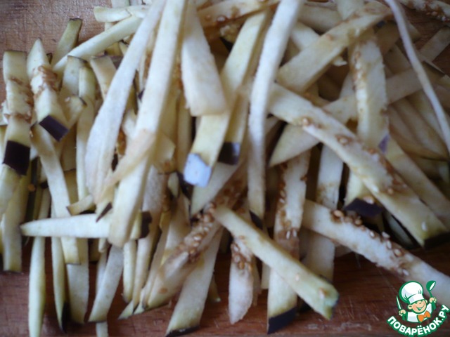 Окунуть в приготовленную смесь нарезанные баклажаны.