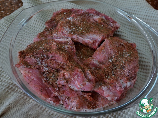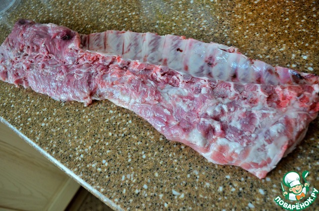 Мясо вымыть, обсушить и нарезать на куски по 2-3 ребра.