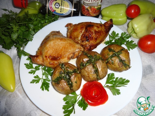 Куриные бедрышки с запечённым картофелем и зеленью с чесноком
