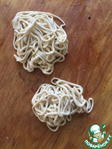 Теперь лапшу кладем в кипящую подсоленную воду и варим по 2 минуты каждую. Готовую лапшу подавать с подливом)Приятного аппетита!