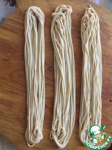 Теперь из лапши среднего размера тянем тонкую лапшу