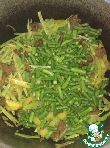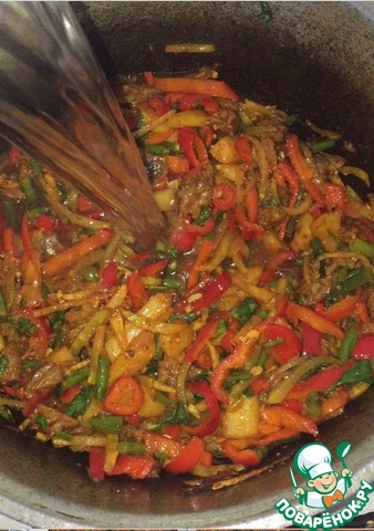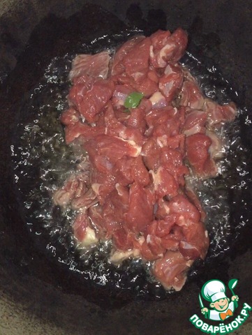 Как масло хорошенько разогреется, кладем мясо. Между каждым ингредиентом соблюдать интервал 2 минуты.