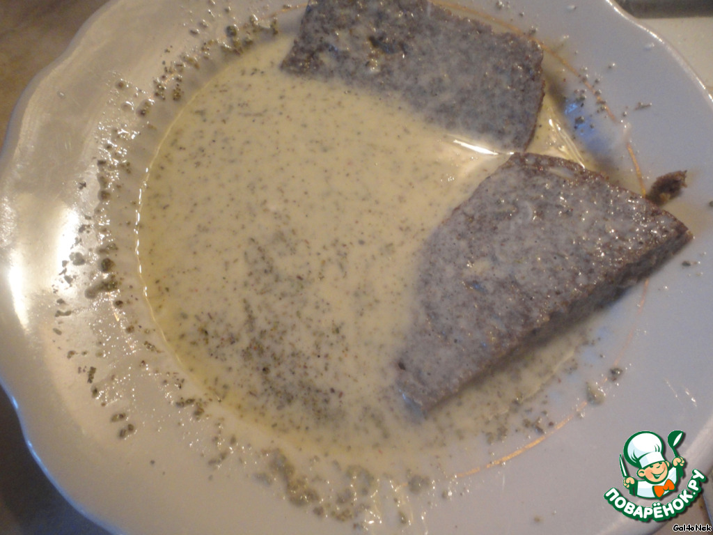 Яйцо смешиваем со сметаной и водой. Подсаливаем, добавляем специи. Моя красавица очень любит прованские травки. Хлеб обмакиваем в эту смесь.