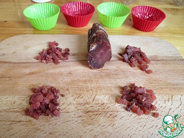 Потом берем что ни будь колбасное или мясное, меленько режем и отправляем в формочки, сверху чуток присаливаем. Так же можно на данном этапе еще что ни будь добавить, на свой вкус. Но перегружать не надо.