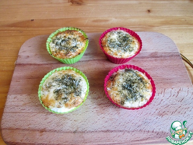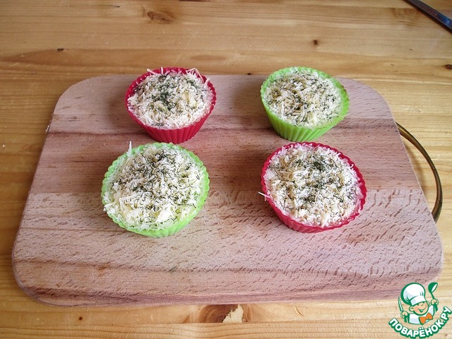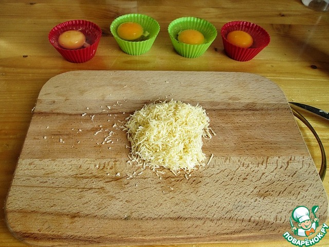 Теперь разбиваем в каждую формочку по яйцу, и немножечко сверху присаливаем, совсем чуть чуть.