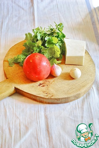 Для начинки возьмите крупный мясистый помидор, пучок кинзы, 1-2 зубчика чеснока и брынзу