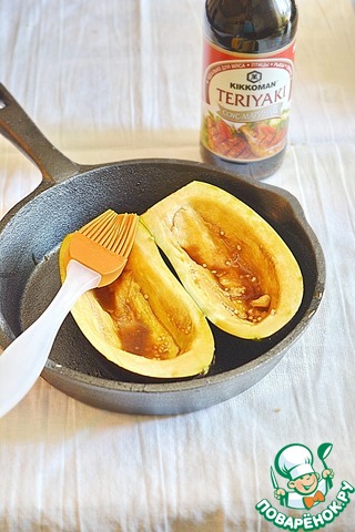 Баклажан разрежьте вдоль, чайной ложной выньте мякоть, оставляя стенки. Смажьте кисточкой баклажаны внутри соусои Терияки "Киккоман" и сбрызните маслом