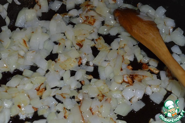 Лук нарезать кубиком и обжарить на растительном масле до легкой золотистости.