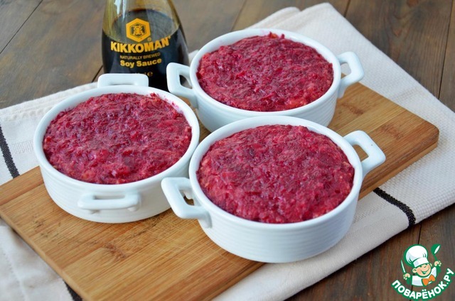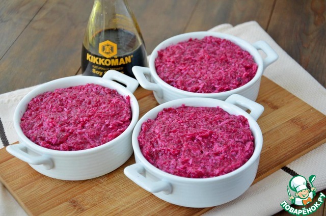 Смешать свёклу с сыром, чесноком. Добавить соевый соус ТМ "Киккоман", муку, яйцо, поперчить. Все хорошо перемешать.