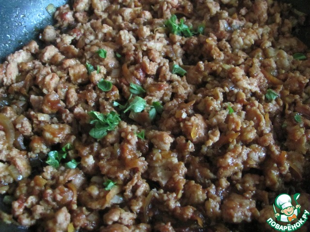 Добавить фарш. Хорошо перемешать, как бы разбивая его. Прожарить.