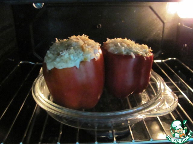Запекать в заранее разогретой до 180 градусов духовке минут 40. Если шапочка начинает сильно румяниться, то накройте перцы фольгой.