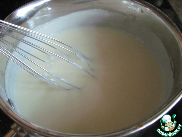 Влить теплое молоко. Размешать, чтобы не было комочков. Довести при постоянном помешивании до закипания и загустения соуса.