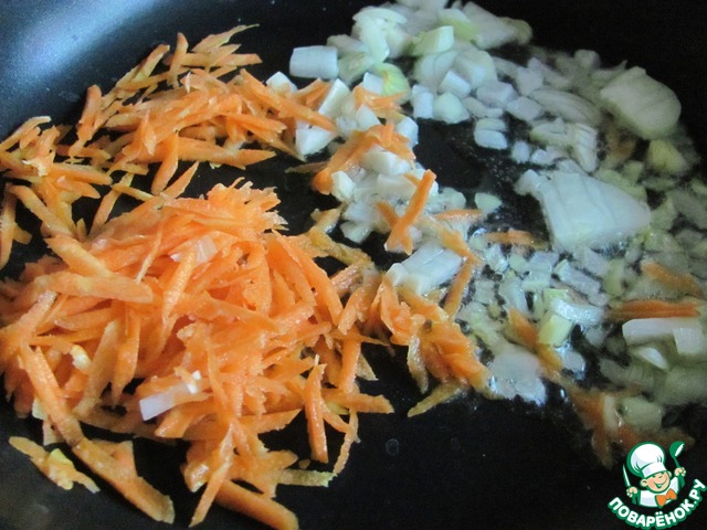 Лук порезать кубиком, а морковь натереть. Все обжарить.