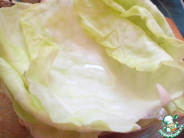 Капусту приготовить как на голубцы, можете своим привычным способом. Я, как появились микроволновки, снимаю листики, укладываю друг на друга, поливаю чуть водичкой каждый листик и ставлю в СВЧ на 20 минут. Если много листьев нужно, вырезаю кочерыжку, наливаю вместо нее водички и так же в микроволновку.