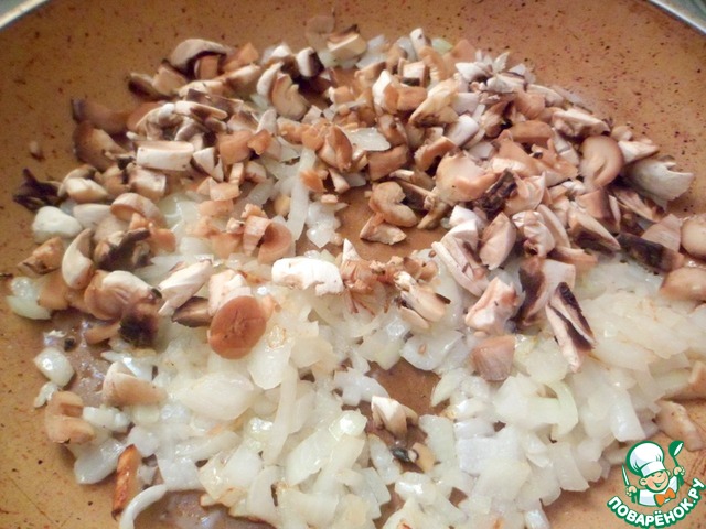 Обжарить на разогретой сковороде с маслом лук, а затем добавить к нему нарезанные грибы.