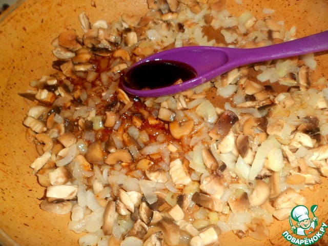 Для подливы. Обжарить на растительном масле нарезанный лук, добавить к нему натертую морковь и добавить соевый соус ТМ Киккоман, сладкий