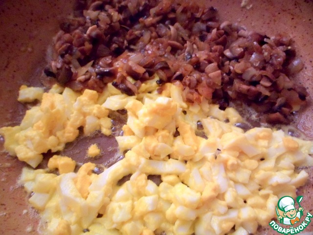 Перемешать яйца и сразу выложить к ним обжаренные грибы с луком.