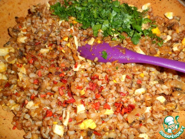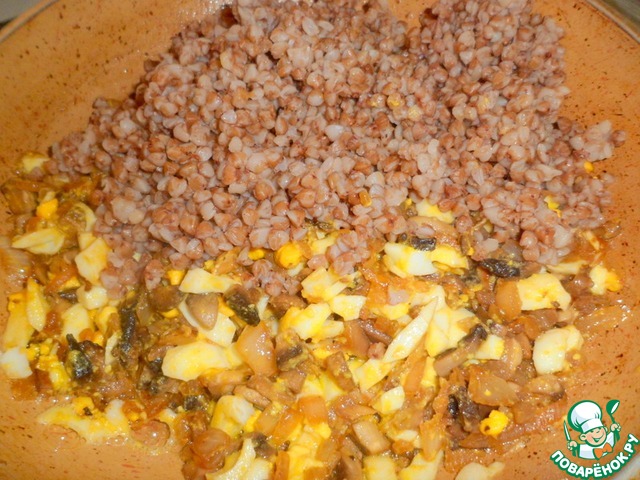 Снова перемешать и следом выложить отваренную гречку.