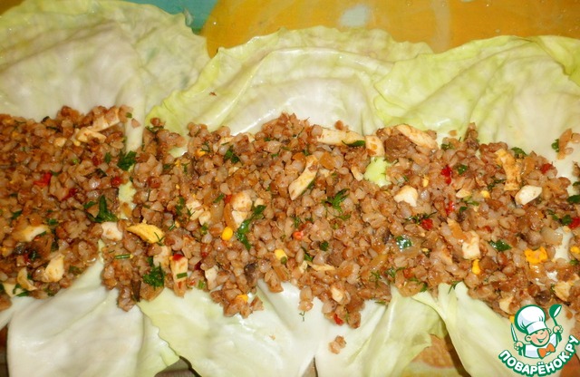 Листья капусты разложить на столе внахлест. У меня получилось 80см в длину. На них разложить начинку из гречки с грибами.