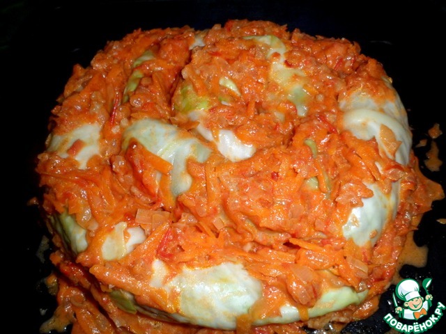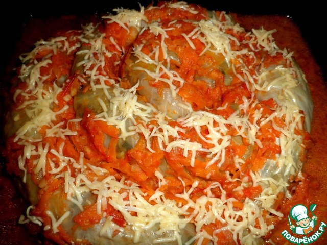 Переложить на смазанный противень, сверху залить подливой. Налить стакан кипяченой воды в противень, накрыть фольгой и поставить в духовку 180°C на 50-60 минут. Смотреть по капусте.