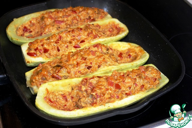 Подготовленные кабачковые лодочки наполнить начинкой, сделав небольшое углубление в широкой части. Отправить в духовку 180-200гр. на 15 минут.