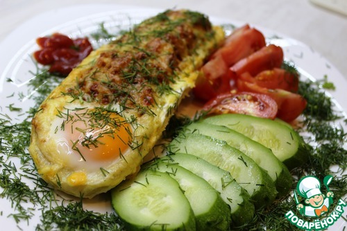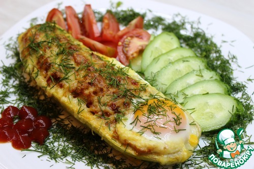 Достать, в каждое углубление вбить яйцо, присыпать тертым сыром. В нашей семье все любят жидкий желток, поэтому у меня добавился еще один шаг. Я отправила кабачки в духовку, чтобы белок схватился.