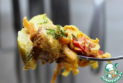 Смешать овощи и мясные шарики. Добавить сметану, томатный соус, любимые специи (сочетание с хмели сунели мне показалось очень гармоничным), измельченный чеснок, перемешать.