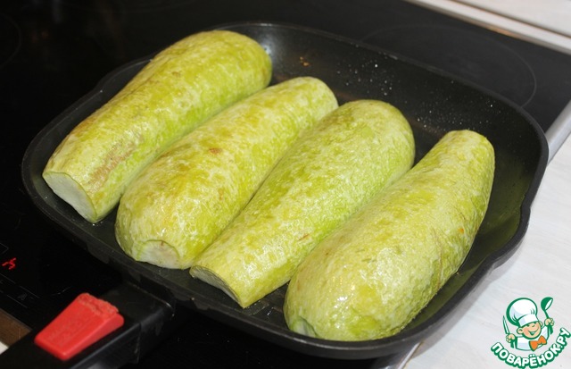 Подготовленные таким образом кабачки уложить в жаропрочную форму дном вверх и отправить в разогретую духовку - 180 градусов минуток на 20-25. В это время займемся начинкой.