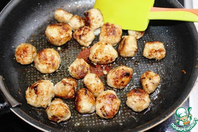 В фарш добавить пропущенный через пресс чеснок, посолить, поперчить, скатать шарики величиной с грецкий орех и обжарить на масле до румяности. Шарики у меня немного кривенькие, разноразмерные – доча лепила)))